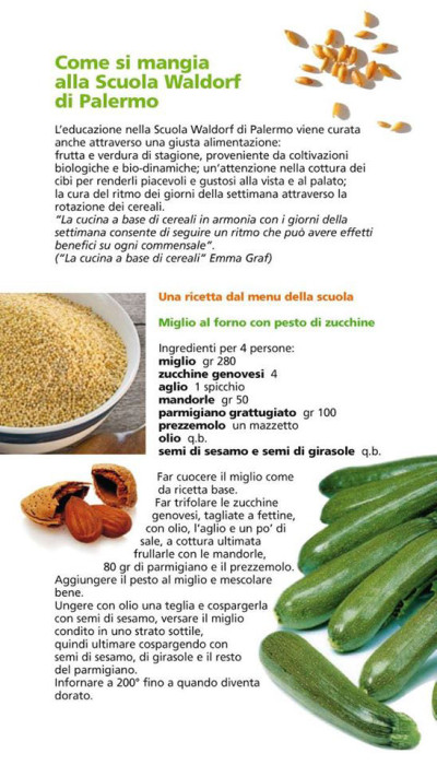 I menu vengono stabiliti in accordo con il medico scolastico. Come alimenti di base si prediligono quelli di stagione. I cereali vengono utilizzati seguendo un ritmo settimanale. Per quanto riguarda la fase di lavorazione, si cerca di mantenere il valore nutritivo dell’alimento. In ogni pasto vengono offerti cibi crudi e cotti.