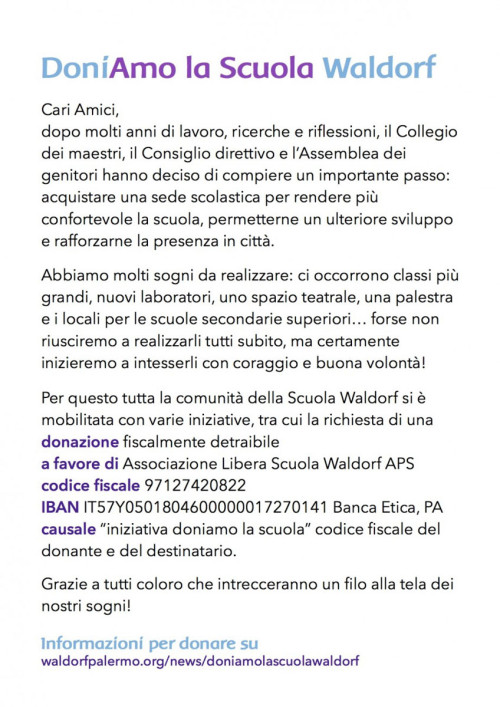La comunità della Scuola Waldorf ha avviato una iniziativa di raccolta di donazioni liberali per l´acquisto della sede scolastica.
