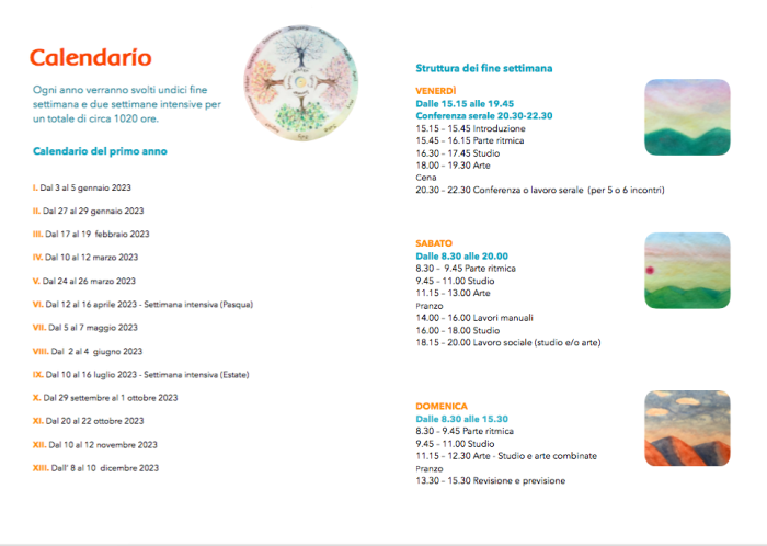 Il primo anno di corso sarà costituito da 11 incontri organizzati nei fine settimana nell´arco di nove mesi e da due settimane intensive.