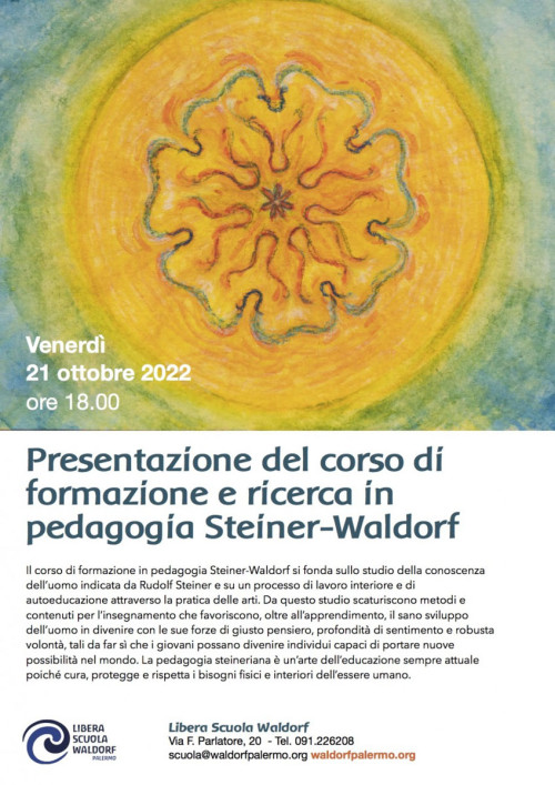 Il corso di formazione e ricerca in pedagogia Steiner-Waldorf promosso dalla Libera Scuola Waldorf di Palermo si basa su una pedagogia che, attraverso il lavoro interiore fondato sulla conoscenza dell’uomo indicata da Rudolf Steiner, possa contribuire alla formazione di educatori in grado di favorire nei bambini lo sviluppo di forze di giusto pensiero, profondità di sentimento e robusta volontà, tali da far sì che i giovani, alla fine del loro cammino scolastico, possano divenire individui capaci di portare nuove possibilità per il mondo. Partendo dalla propria autoeducazione e attraverso una pratica artistica che risveglia negli uomini approcci conoscitivi non astratti, l’allievo del corso potrà coltivare fiducia ed entusiasmo verso il futuro per trasmetterli alle nuove generazioni.