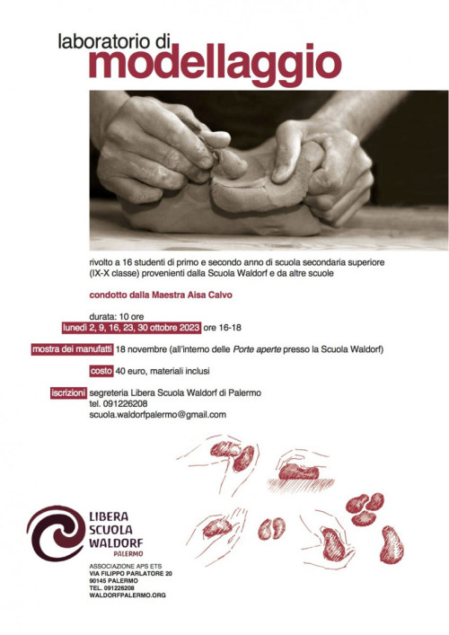 Il laboratorio di modellaggio è rivolto agli alunni delle scuole superiori di IX e X classe (I e II anno). Gli incontri si terranno ad ottobre i lunedì dalle 16 alle 18 secondo il seguente calendario 2-9-16-23-30 ottobre. Il laboratorio fa parte del ciclo di incontri