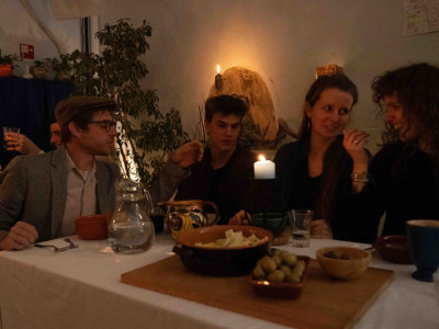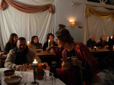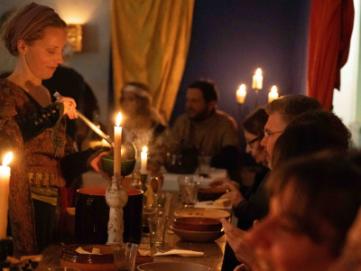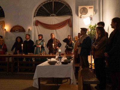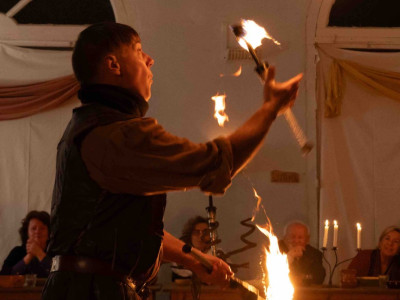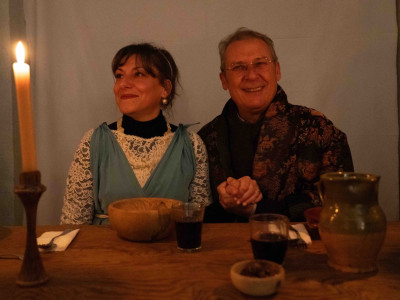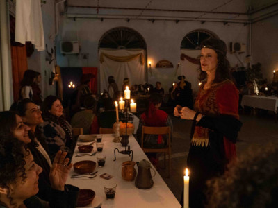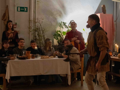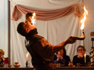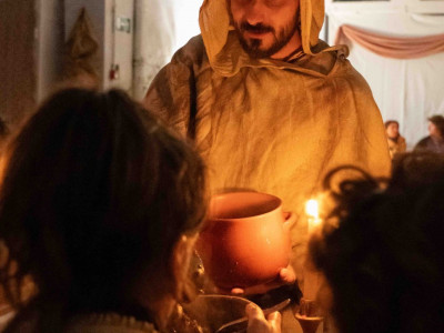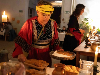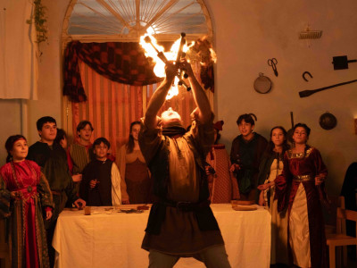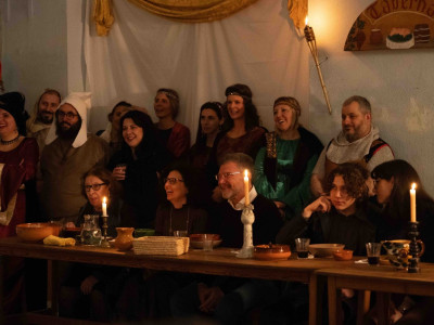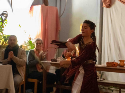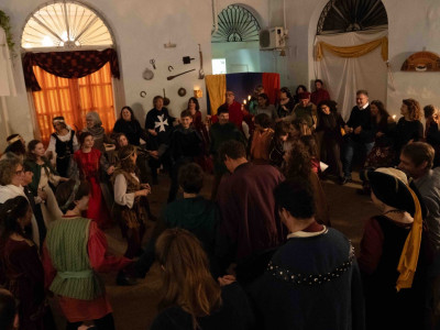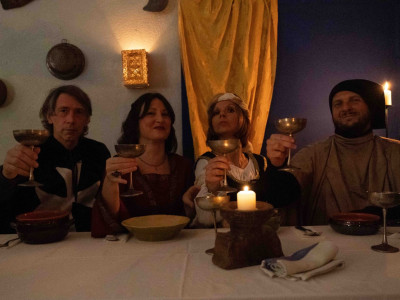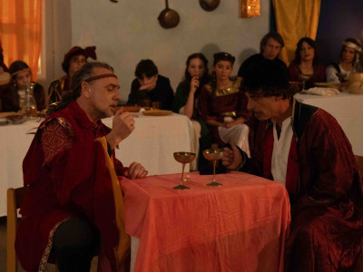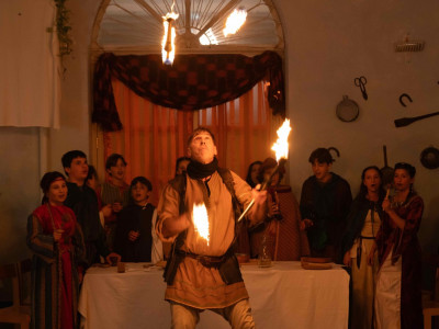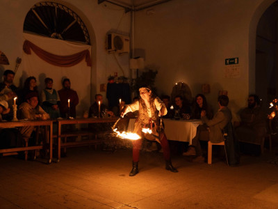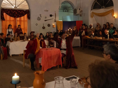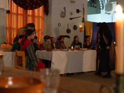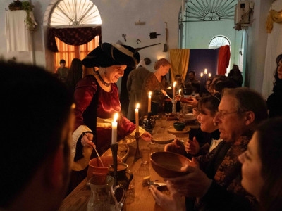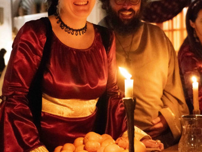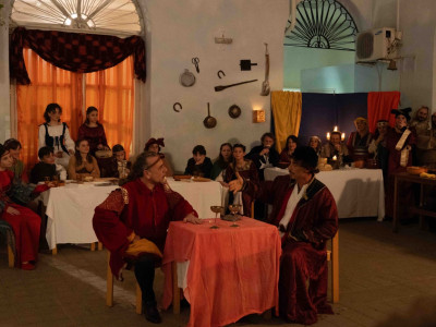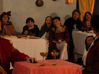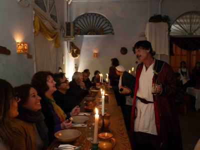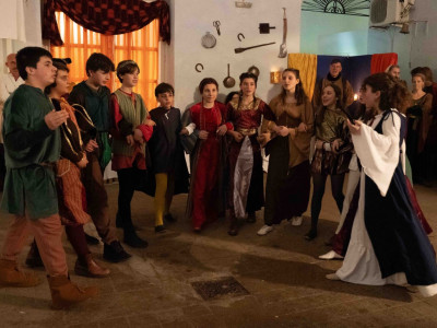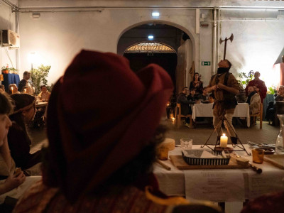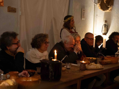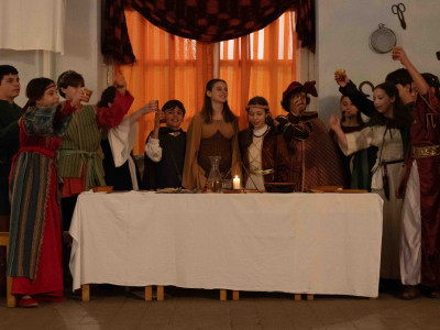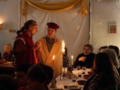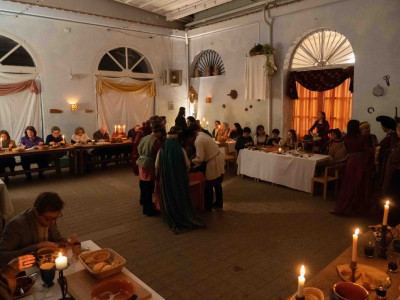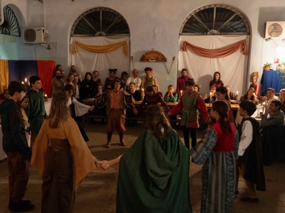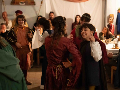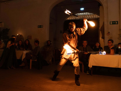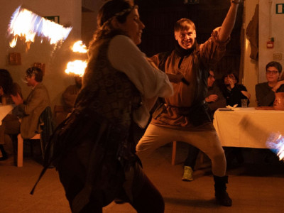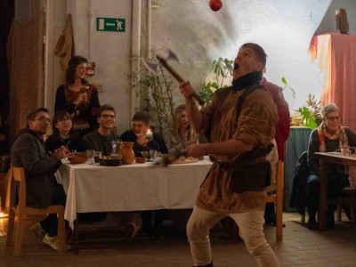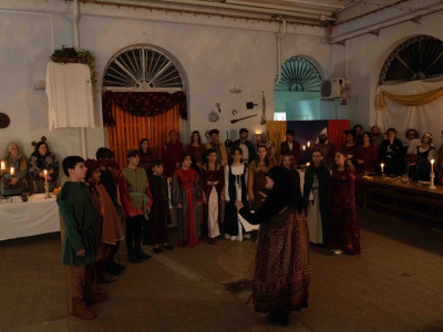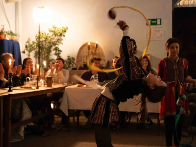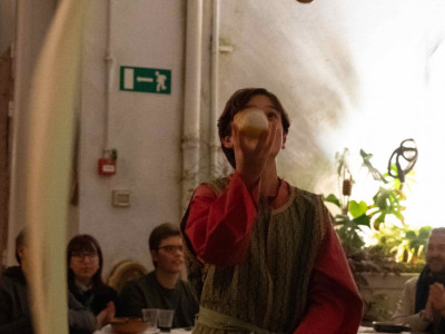 La serata ha avuto inizio con dei canti guidati dalla maestra Gaia e poi, tra una pietanza e l´altra, sono arrivate le sorprese: sonetti medievali, canti di taverna, divertenti scenette, acrobazie e giochi giullareschi.