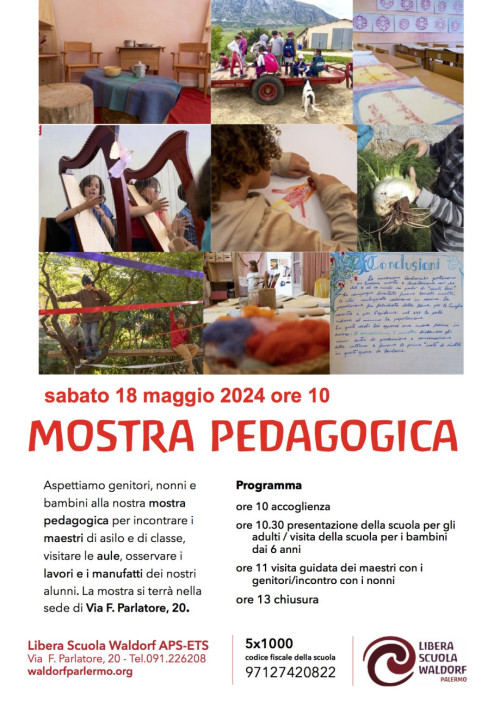 Il 18 maggio si terrà la nostra mostra pedagogica a cui sono invitati i genitori, i bambini e i loro nonni. Vi aspettiamo dalle 10 alle 13 in Via Parlatore, 20.